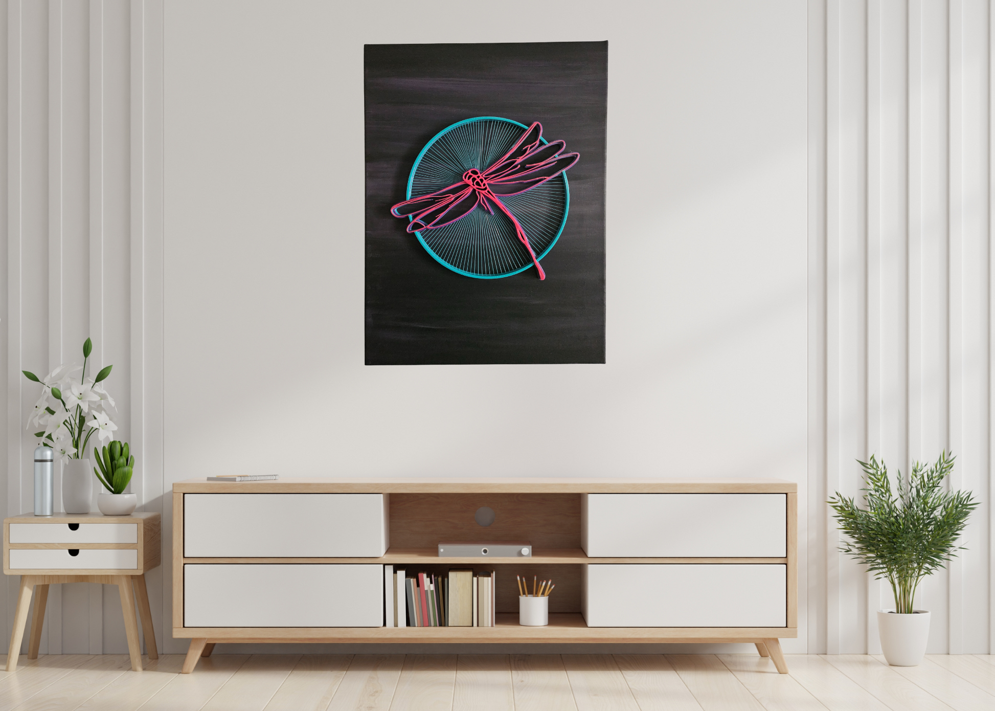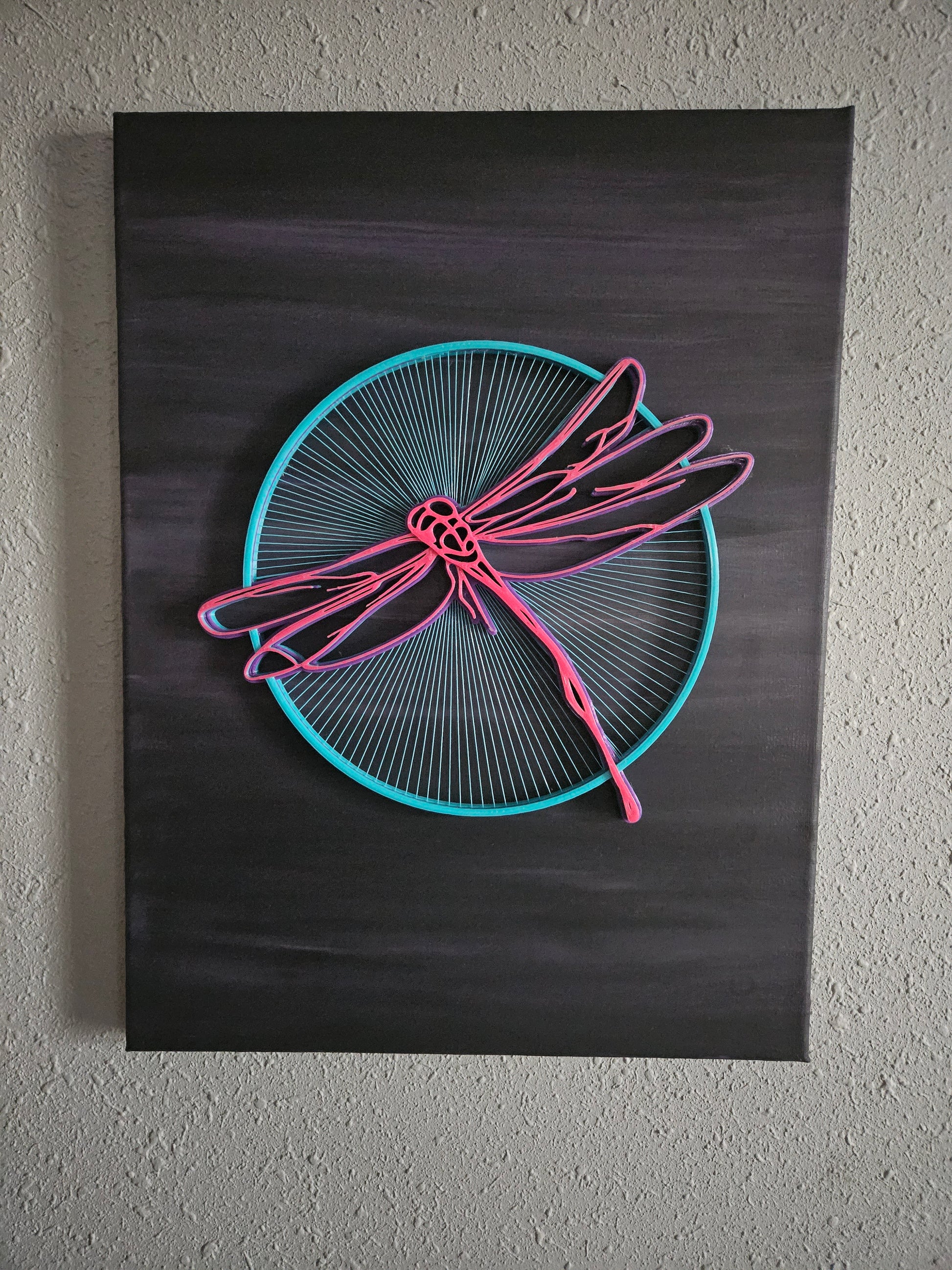 A Light in the Dark is a handcrafted, one-of-a-kind piece of art. This colorful dragonfly is 3D printed with intricate string work and set on a handpainted canvas. Perfect for any home, office, or gallery wall, it will be a beautiful addition to any space. Painted with Acrylic medium on a high quality 16x20" stretched canvas.