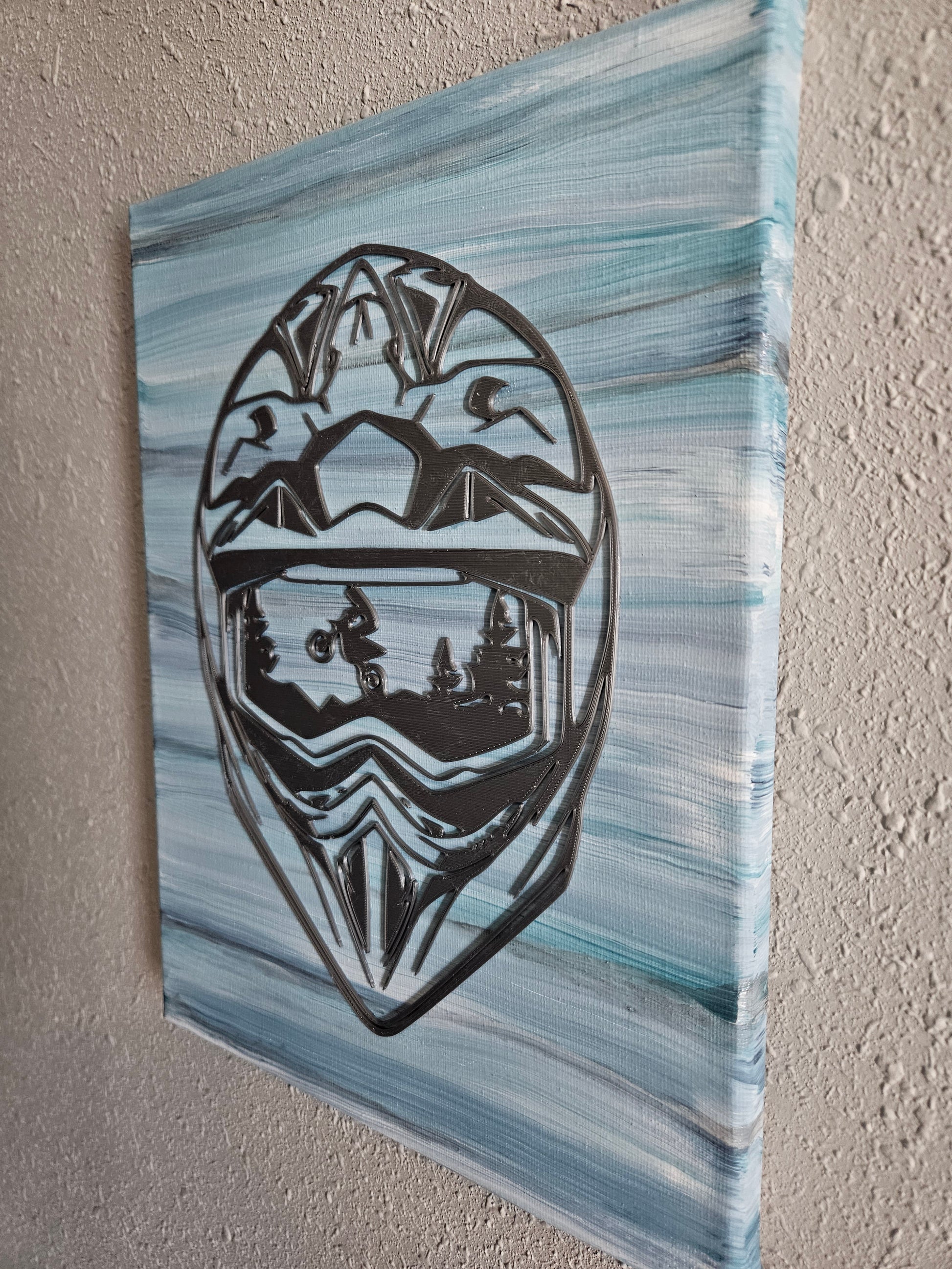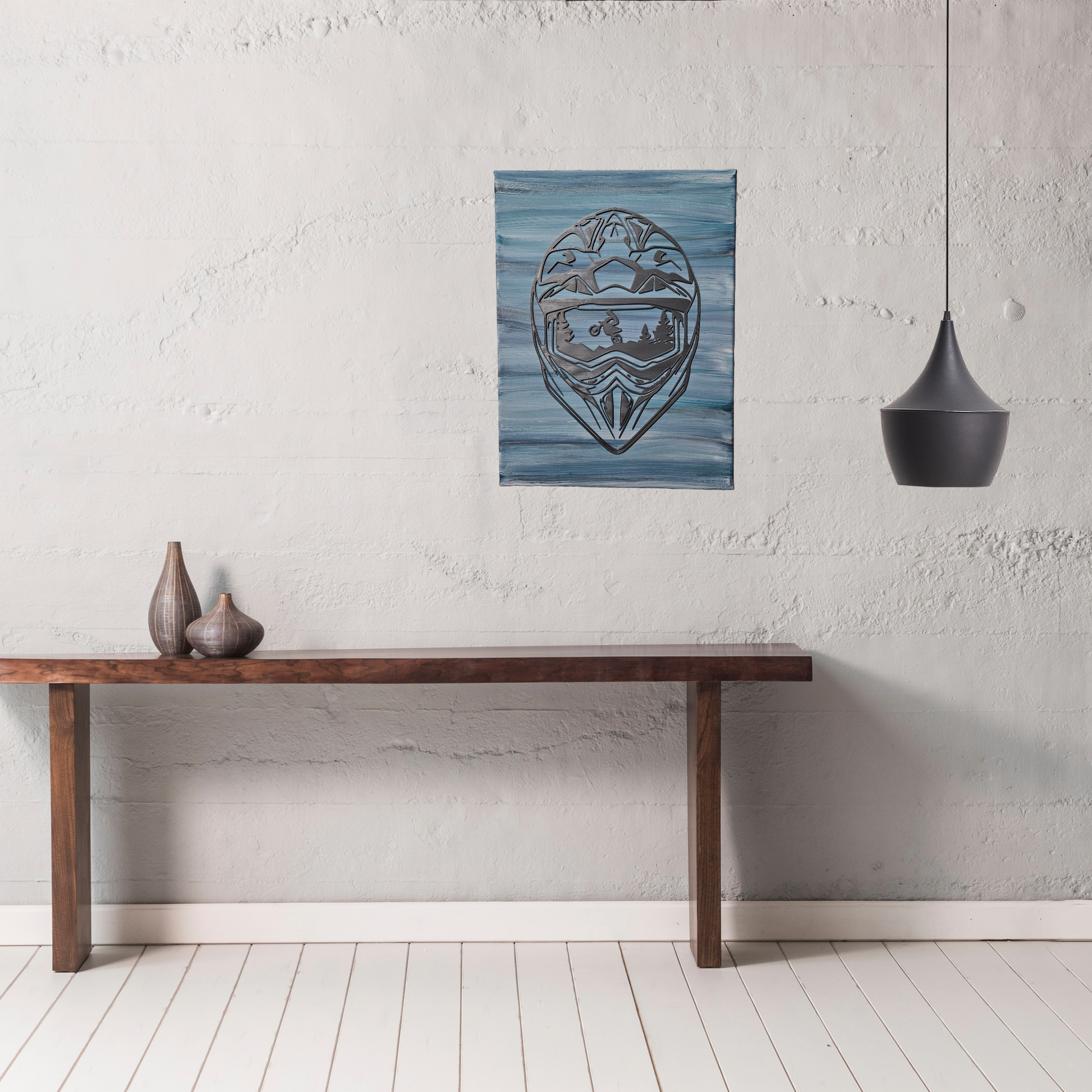 "Adrenaline" is a one-of-a-kind, original abstract painting, featuring a double exposure Helmet designed together with a dirt bike and mountain scene. Painted with Acrylic medium on a 9x12" high-quality canvas. 3-D printed design made with premium-grade filament.