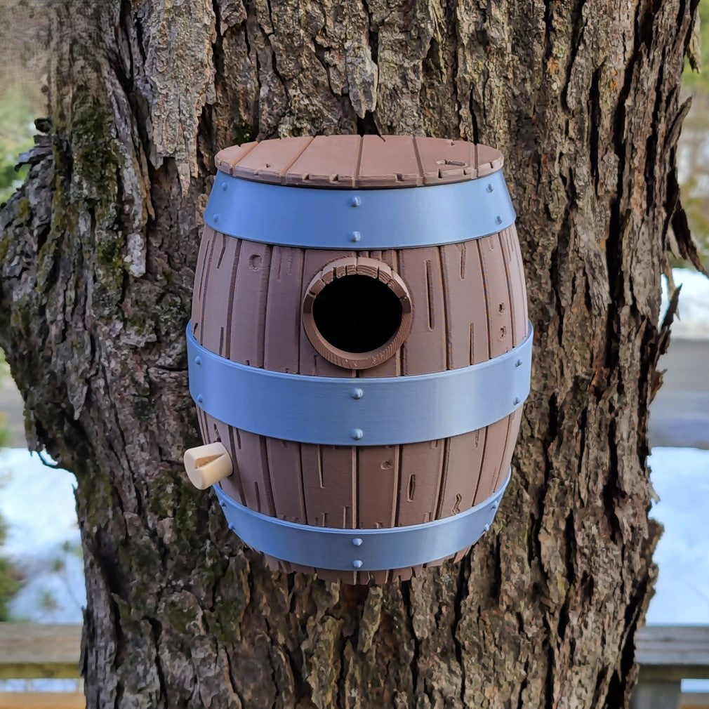 This barrel birdhouse provides a cozy and safe home for our feathered friends. Its unique design adds rustic charm to any garden while its sturdy construction ensures durability. Made from high-quality materials, this birdhouse is the perfect addition to any bird lover's collection.