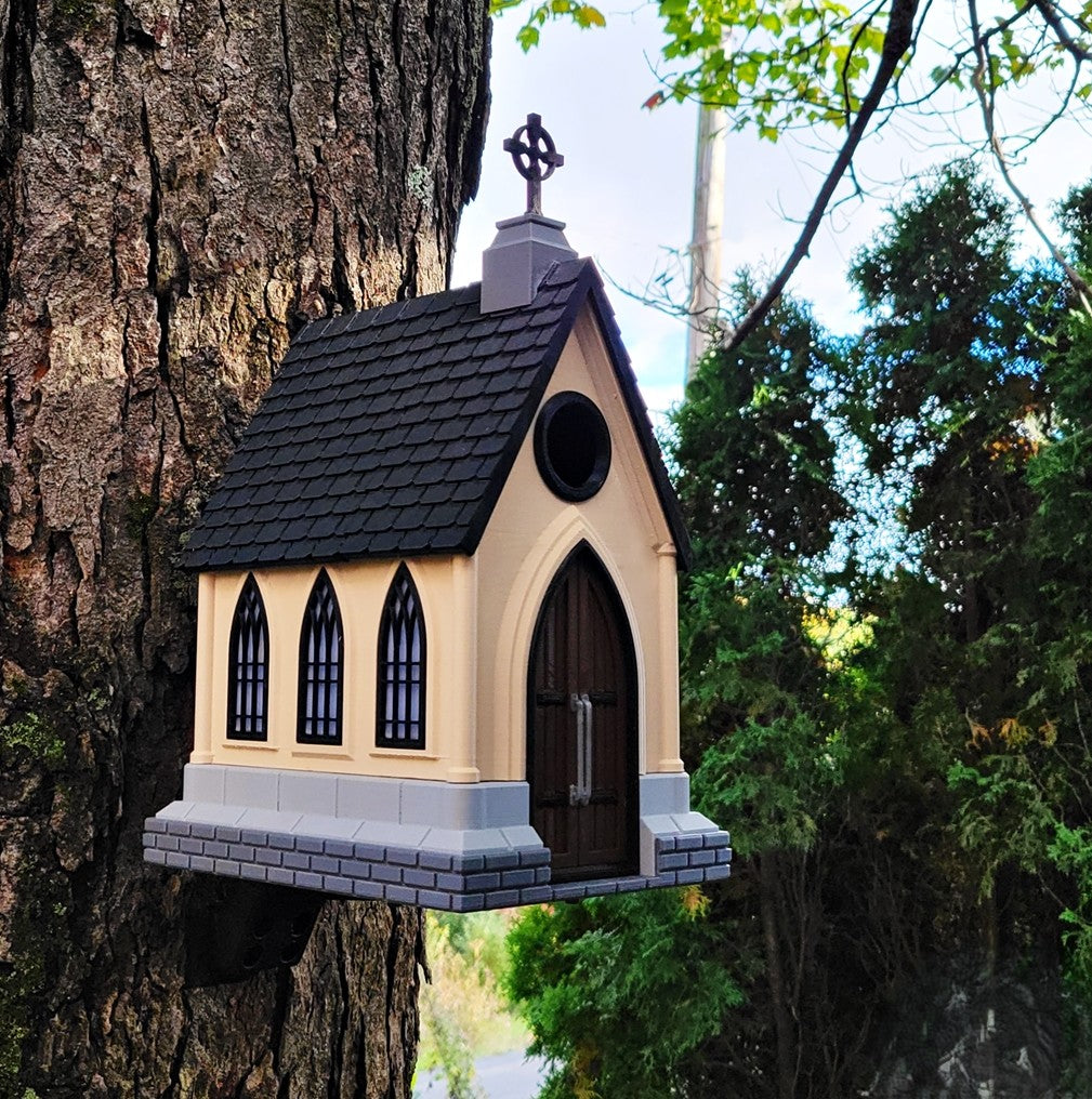 Transform your backyard into a fairytale with our Gothic Chapel Birdhouse! This handcrafted birdhouse showcases intricate gothic details and provides a cozy home for feathered friends. Add a touch of whimsy and charm to your outdoor space while also giving back to nature.
