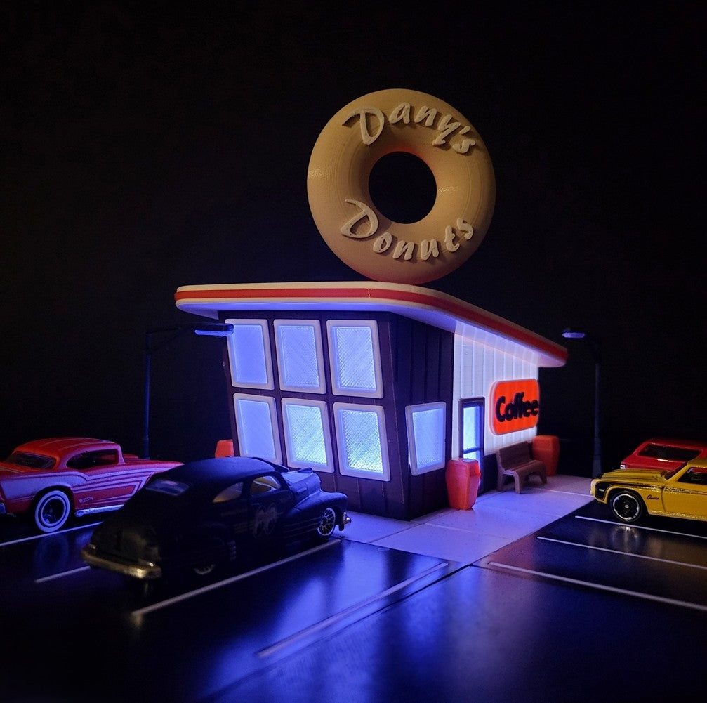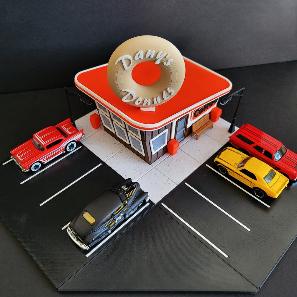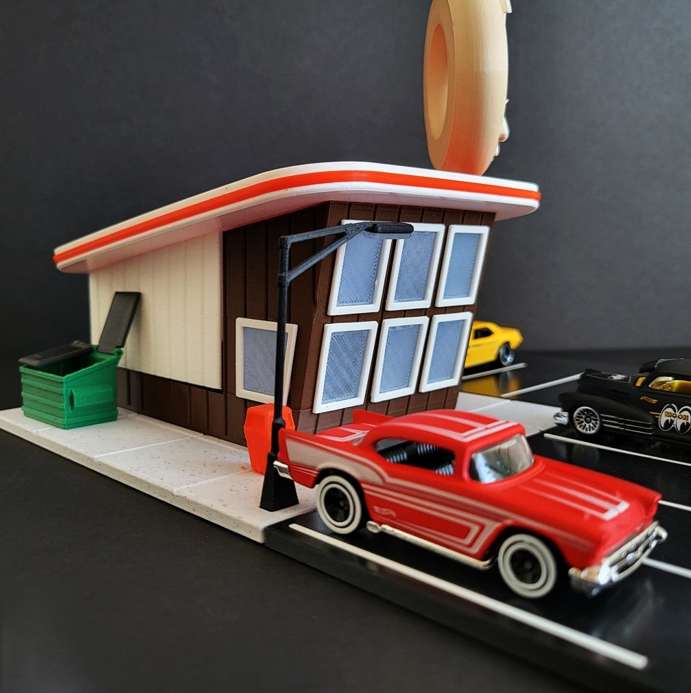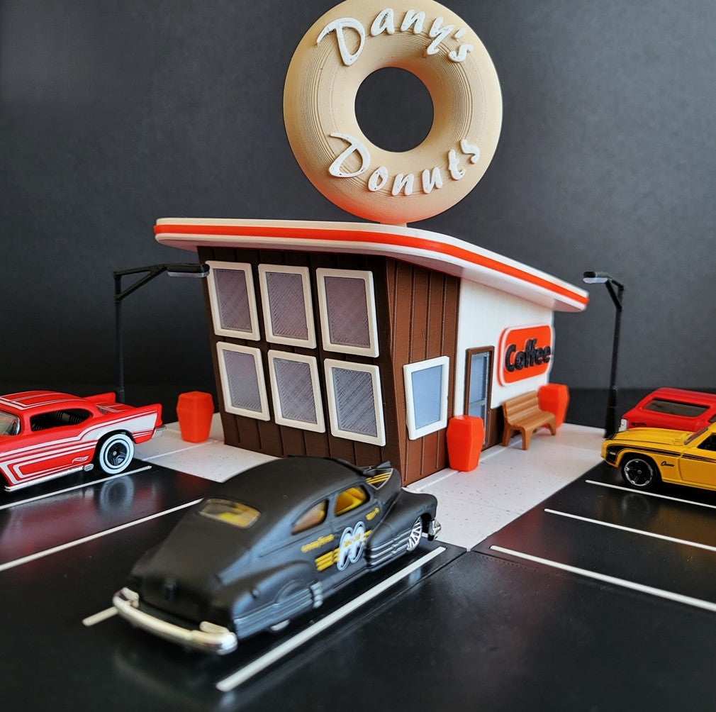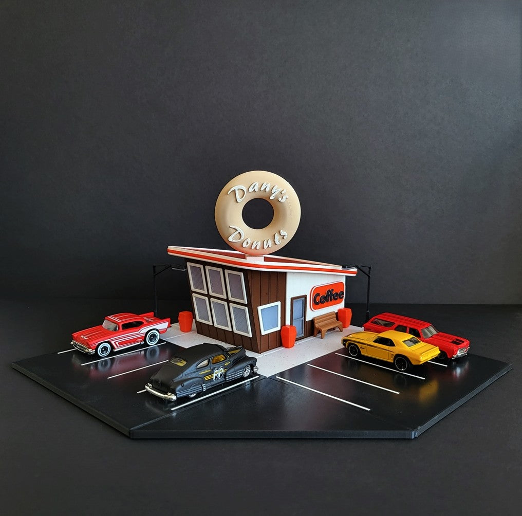 Transform your Hot Wheels collection with our Donut Shop Display! This diorama features a fun and interactive donut shop, perfect for showcasing your favorite Hot Wheels. With intricate details and eye-catching design, this display will elevate your collection to the next level.