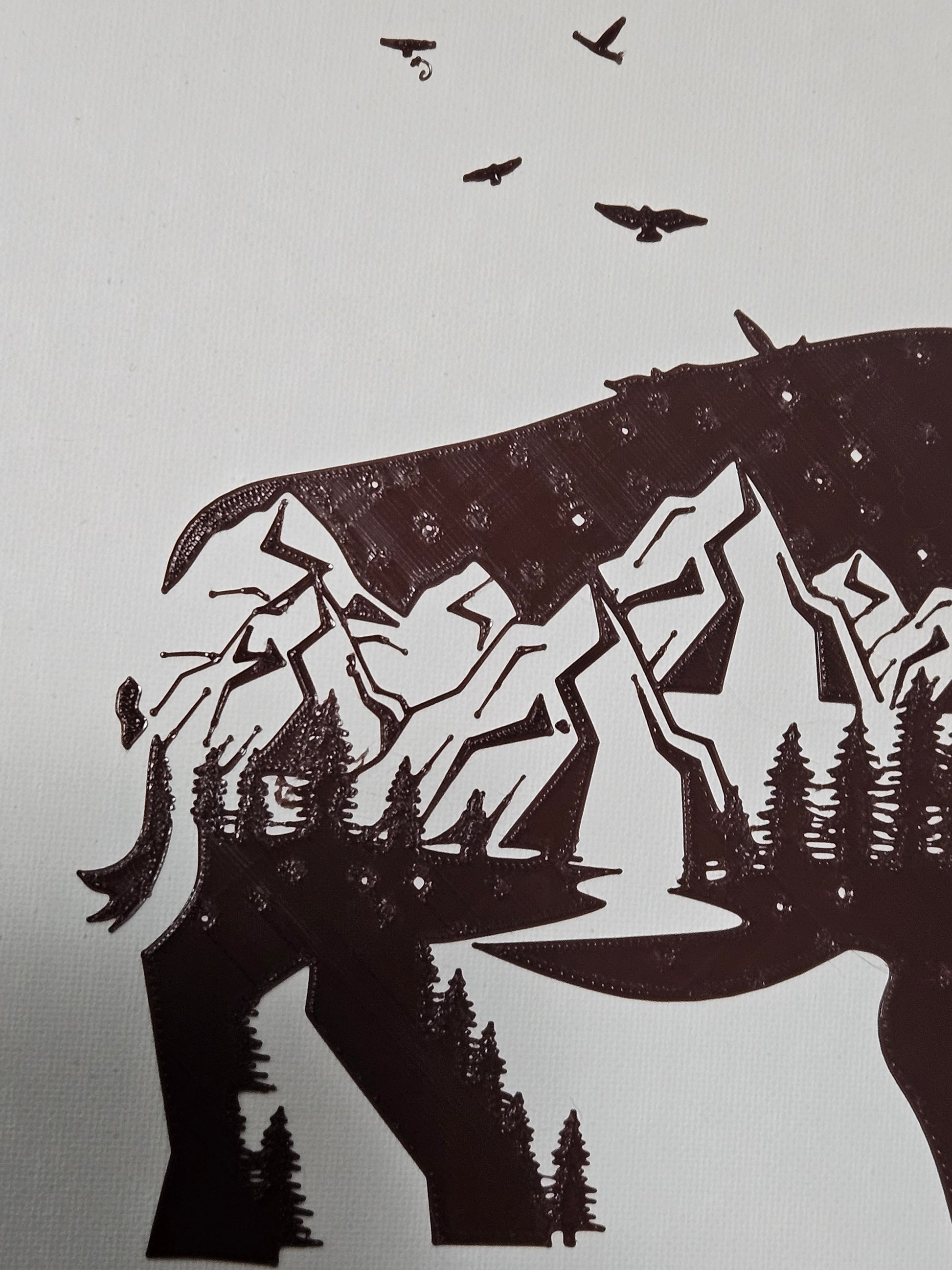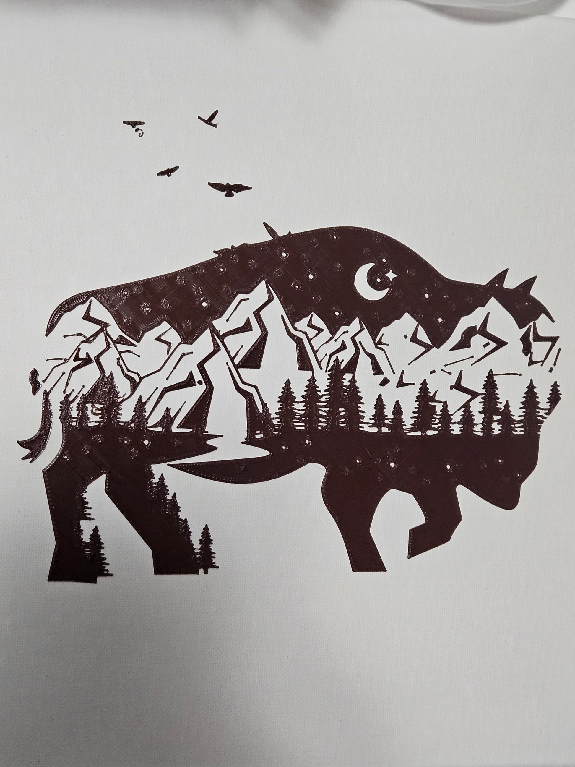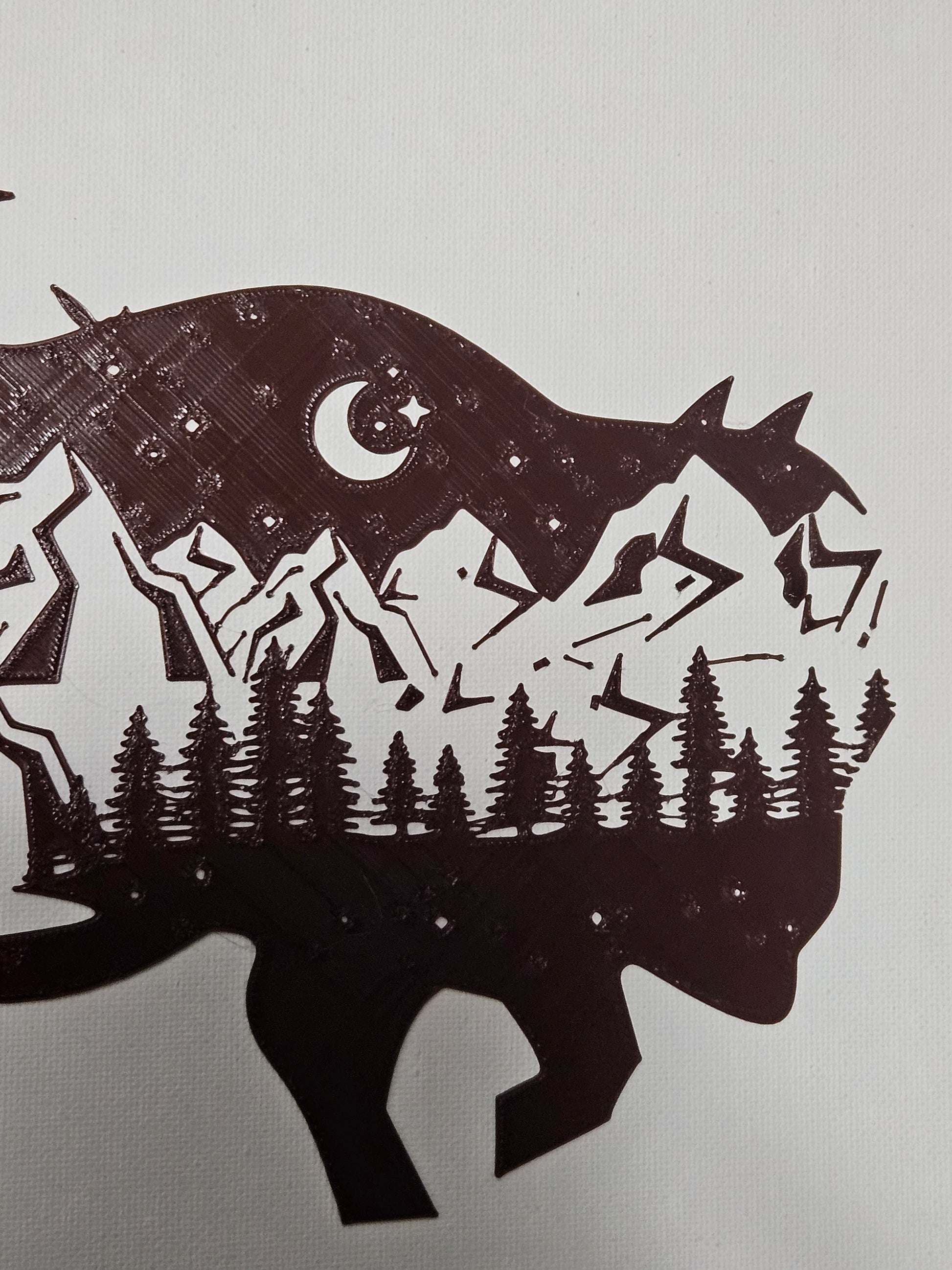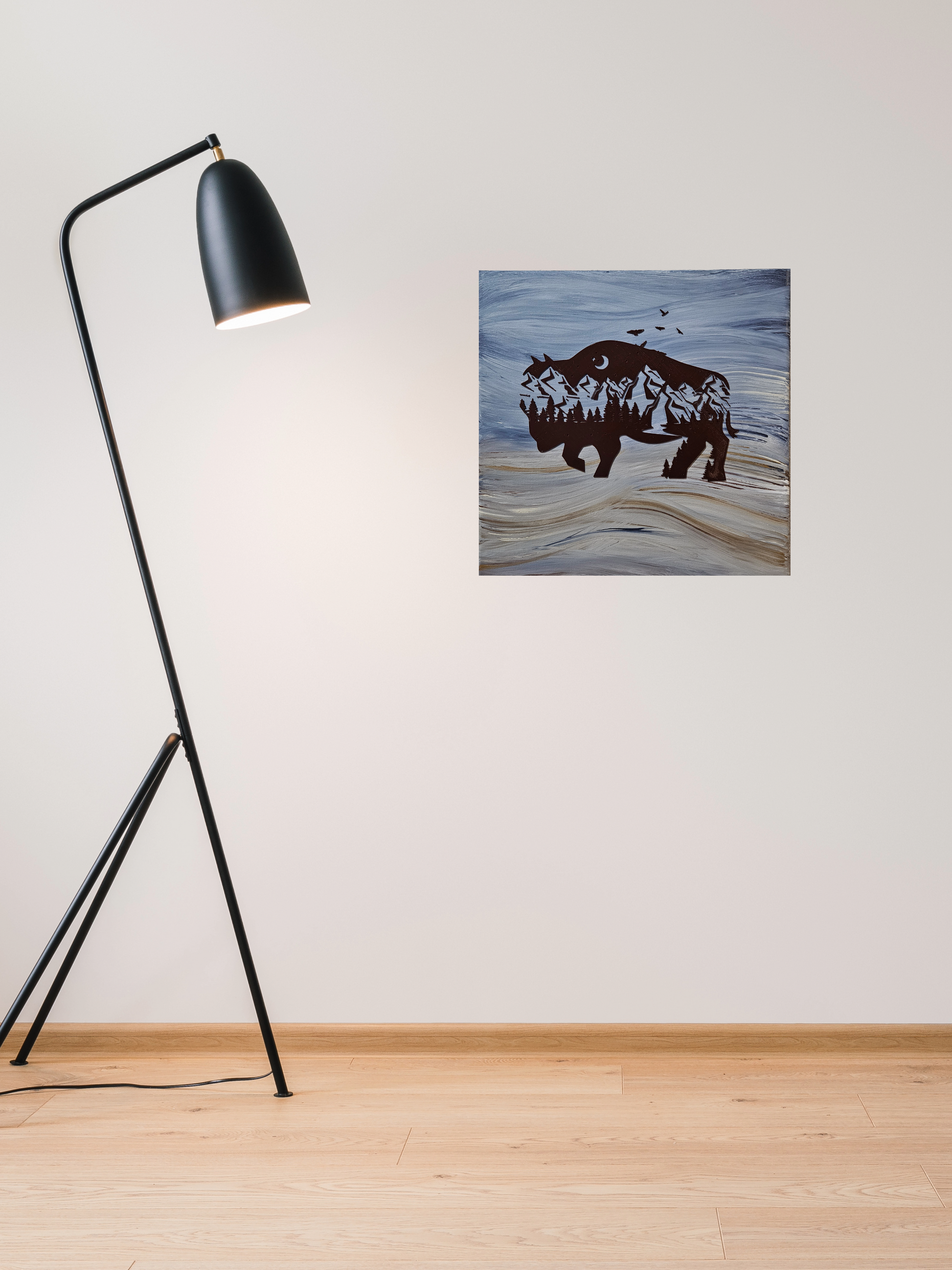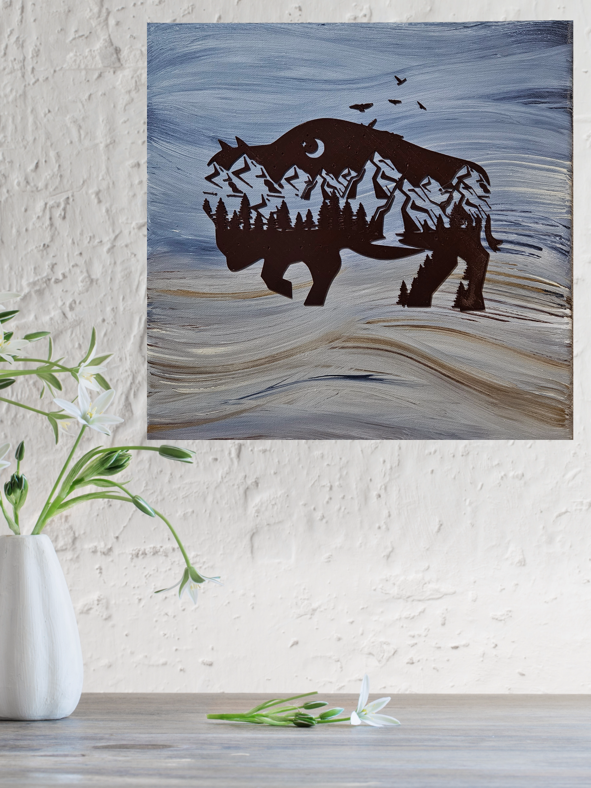 "Rolling Arctic" is a one-of-a-kind, original abstract piece of art featuring a double exposure bison design portraying a beautiful mountain scene. Painted with Acrylic medium on a 12x12" high-quality canvas. 3-D printed design made with premium-grade filament.